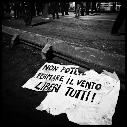 Quello che è successo alla fine del corteo era pre-scritto dalla scenarizzazione cristallizzata in cui trovano posto la militarizzazione dello Stato autoritario e quella parte di manifestanti, non chiaramente individuabile ma riconoscibile, che si pensa come il suo rovescio; che lì si scoprono paradossalmente solidali nel bisogno dell'altro, in un agire che si nutre ancora di simbolica e di miti del passato, come il conflitto identitario. Qualsiasi cosa possa dirsi la sinistra non credo possa essere l'immagine simmetricamente opposta della destra.