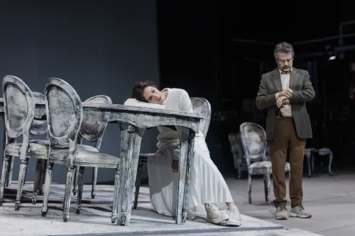 I costumi di Gianluca Sbicca e le luci di Pasquale Mari accompagnano questo svanire, questo pietrificarsi, con una compagnia con due giovanissimi, Riccardo Martone e Francesco Aricò, nei ruoli di Tuzenbach e Solënyj, attori di esperienza e caratura come Rosario Lisma (il colonnello) Giovanni Battaglia (il dottore), Marco Quaglia (il marito di Masa), con la Nataša stridente nei vestiti e invadente di Giordana Faggiano, il rassegnato suo marito di Antonio Mingarelli. Le tre sorelle sono attrici dalle molte sfumature: perentoria e disincantata è la Maša di Valentina Bartolo, rassicurante e via via sempre più spenta la Olga di Irene Villa, giovane piena di speranza e già convinta, nell’intimo, della propria irrimediabile sconfitta l’ingenua Irina di Livia Rossi. In uno spettacolo molto applaudito, che incanta e inchioda a un dolore, che è quello nostro attuale della frammentazione, dell’assenza di orizzonte.