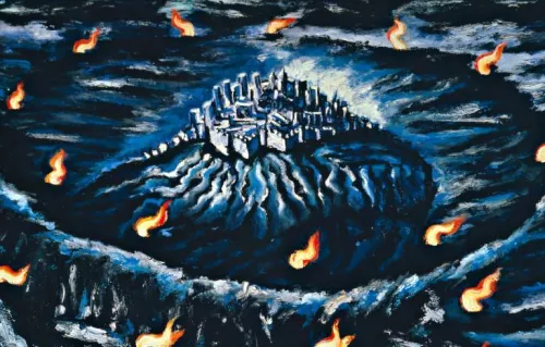 Questo ex voto qualcuno lo ha fatto, una mano di uomo lo ha tracciato, ed è arrivato fino a noi, a porci le sue domande. È arrivato su una tavola di grandi dimensioni, olio su tela, ha attraversato più di tre decenni, è arrivato tutto blu emerso dal nero, trafitto e gocciolante di fiammelle e argentei bagliori. Malgrado la nostra incredulità, si sente chiaro il boato che lo ha germinato, assumendo la forma di mandorla di luce spiccata dal cuore. Cosa ci mostra? Una “selva oscura”, una notte in cui ardono decine di fiammelle disposte a corona, e al centro, sospesa su un monte, una fortezza dalle mura orlate di cuspidi. Oppure è l’ombra di una città, con le sue case e le sue torri svettanti, ora dormiente, o abbandonata, o stregata. La selva però potrebbe anche essere un cielo, e quelle onde bianche nuvole che segnano il manto notturno, e le vampate stelle vorticanti. Un tuono ha fatto scaturire dal suo fragore questa mandorla, sospesa chissà dove, e ha guidato la mano del pittore.