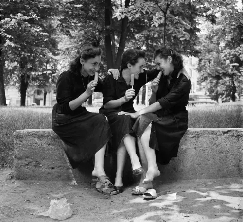 La felicità è giocare per strada, gustare un gelato durante la pausa pranzo, fare il bagno in piscina prima di tornare in ufficio. La Vodoz non fotografa la fabbrica, le sbarre invisibili entro cui gli operai sono imprigionati, ma il tempo trascorso lontano dai reparti, dalle macchine, dalla fatica. Se nel ritmo rigoroso delle otto ore, ogni turno scandisce gesti e movimenti, quando le persone escono dai cancelli si apre uno spazio in cui il corpo respira, il gesto si libera e il ritmo della giornata sembra dilatarsi. È la stessa atmosfera che attraversa Milanesi per otto ore (1954), dove i pendolari conversano durante il viaggio in treno e attraversano in bicicletta una città immersa nella luce dell’alba.