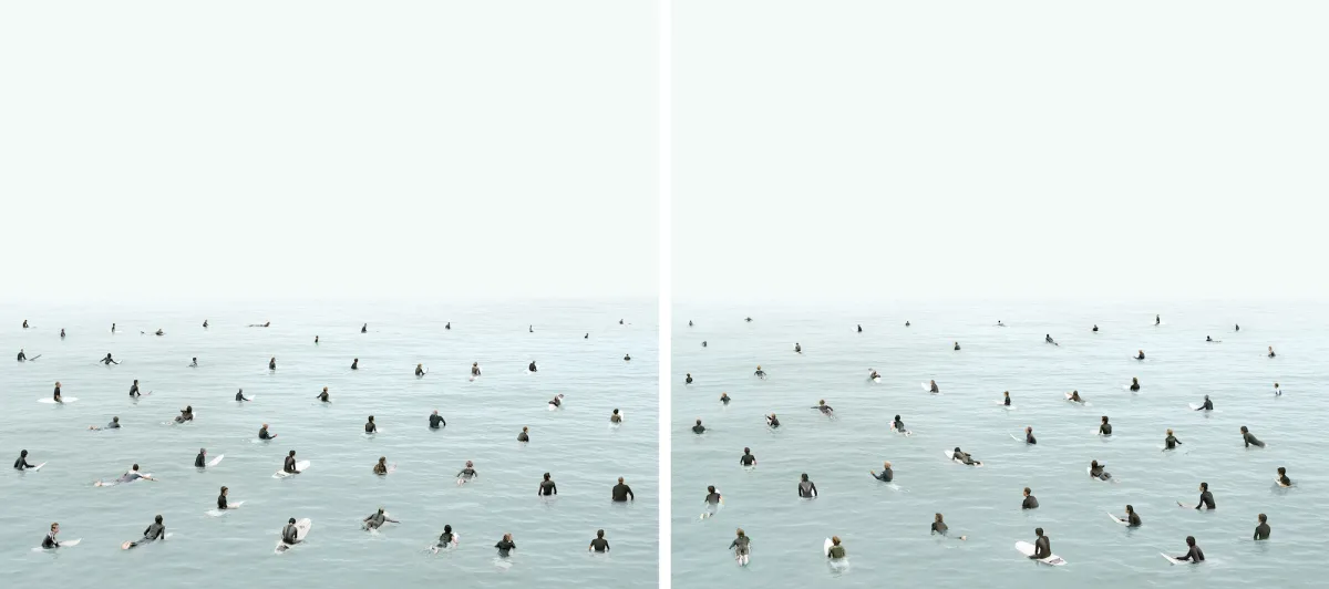 FJ: The Surfers come opera nasce addirittura dopo la fine del progetto WEST, infatti io non considero The Surfers una vera opera di WEST, anche per un motivo banale, che tutte le fotografie di WEST, per quanto strane, sono “vere fotografie”, il dittico The Surfers è l'unica falsa perché è costruita. Io e Sara Gentile, la mia compagna, abbiamo fotografato l’Oceano Pacifico all'alba, in modo che fosse placido, quindi non un mare da surfisti perché non ci sono onde, e poi nei giorni successivi con dei teleobiettivi abbiamo fotografato 80 surfers, poi li abbiamo montati in questa specie di parlamento, di spazio simbolico e corale.