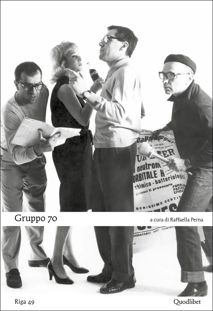 Gli scritti raccolti in questo numero di “Riga” mirano a restituire la qualità militante del pensiero e delle pratiche del Gruppo 70, mostrando come le istanze politiche s’intreccino strettamente con l’urgenza di superare gli steccati disciplinari e aprirsi a una dimensione estetica collettiva e diffusa. La prima sezione, Scritti del Gruppo 70, propone un’ampia selezione di interventi firmati dagli esponenti del gruppo in occasione di dibattiti sulla Poesia Visiva e Tecnologica apparsi, dal 1963, su riviste di arte e letteratura (“Nuova Presenza”, “Letteratura”, “Arte Oggi”, “Bit” e altre) e nei cataloghi di mostre: ne emerge un quadro di grande coerenza, che rende chiara la necessità avvertita da questi autori di accompagnare la pratica artistica e l’attività espositiva con una aggiornata riflessione critica sul ruolo dell’artista nella civiltà dei consumi, sul suo rapporto con l’industria culturale e soprattutto con i cambiamenti sociali in atto.