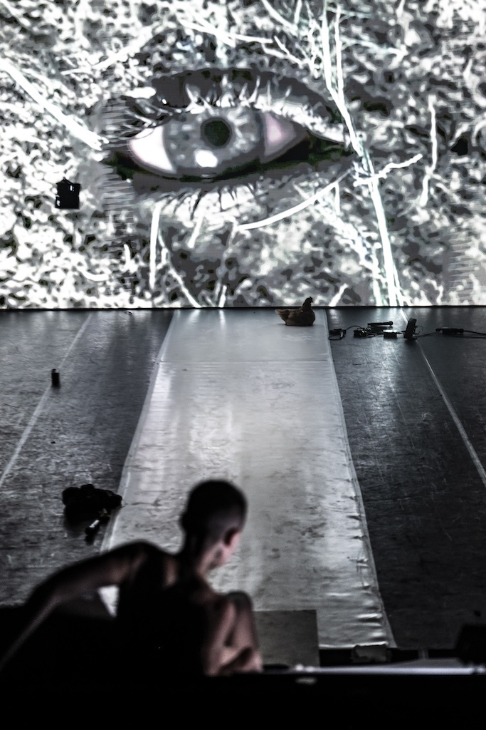 A tutto questo dà lava, ghiaccio, abisso, terra, fioritura, volo Federica Rosellini come attrice. Con una dizione chiara, chiarissima, capace di risonare infinitamente nello spettatore, anche giorni dopo la visione, e nello stesso tempo complessa, martellante, polifonica, come la sua performance fisica senza tregua, il suo mettere alla prova il corpo e le sue estensioni mentali, distendendosi in tutto lo spazio, seguendo la striscia bianca che in realtà è uno stretto tappeto di danza, arrampicandosi sulla gradinata, tra gli spettatori e i lastroni rovinati, portandoci con la sua visione interiore a proiettarci, noi che guardiamo, negli schermi dove viene narrata per lampi, per apparizioni e scomparse, la storia e il mito della terra, mentre le parole richiamano favole antiche e immagini ci mostrano occhi, un occhio femminile fiorito di terra e erbe, sempre tenendo al suo fianco la fedele gallina, ultimo residuo campagnolo dell’arcaica genia dei dinosauri.