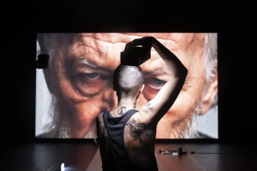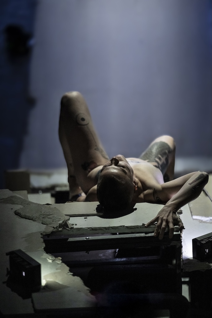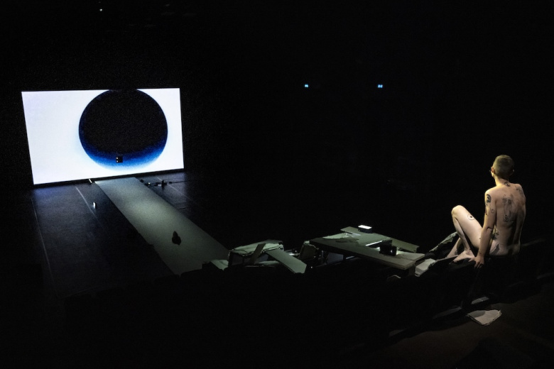 Su quello stretto sentiero, inerpicandosi o perdendosi nelle visioni che lo schermo di fondo fa palpitare, forme geometriche, paesaggi, facce di vecchi padri, quadri di angeli, un piccolo rettile su volto femminile che sprofonda nell’antro dell’orbita dell’occhio, vive il corpo di una donna. Un corpo androgino, con i capelli rasati cortissimi, con lunghe gambe contenute in una tuta che a poco a poco cadrà lasciando la pelle completamente nuda. Nuda e tatuata, con colori vivacissimi, con gli Arcani maggiori dei Tarocchi, una storia dell’umanità per archetipi. Ventuno, non ventidue, perché il primo e l'ultimo è il corpo stesso che agisce, che parla, che ripercorre ere storiche e interiori, rivelando quei disegni che rimandano alle decorazioni delle caverne, alla preistoria, rievocando il passato remotissimo, quello dei pacifici Neanderthal distrutti dalla nostra genia dei Sapiens, quello dei dinosauri che sicuramente sopravvivono sotto la cattedrale di Saint Paul a Londra, scontrando il presente della grande mutazione climatica, dello scioglimento delle nevi perenni, della desertificazione, e quindi un futuro di apocalisse, di rivelazione della forza distruttrice dell’uomo. E qui per “uomo” intendo proprio l’essere umano di sesso maschile, il guerriero, il detentore dei poteri, il patriarca, capace di divorare ogni cosa, perfino le ere geologiche, con la sua brama di possesso.