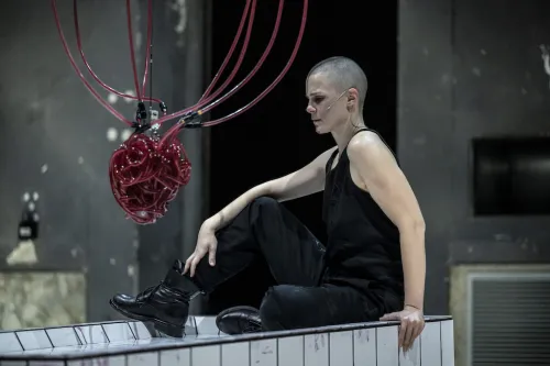 Nella grande sala tre tavoli autoptici. Su uno giace una figura femminile, sopra un grande cuore di tubi sospeso, e nient’altro. Il testo si modella in gran parte sulla trama di Stoker, resa essenziale. Nel buio, ci guida dal corridoio, in questo castello in Transilvania, lo stesso Jonathan Harker (Michele Eburnea), agente immobiliare che deve regolare un acquisto di casa in Inghilterra fatto dal proprietario, il Conte Dracula, interpretato da Federica Rosellini, ancora una volta in una prova superlativa, sia di attrice che di performer. Dracula si presenta nei suoi molti volti, minaccioso, arrogante, malinconico, vive la tragedia del tempo: ha perso la donna che ama, ora esiste in eterno per ritrovarla, crede di riconoscerla nella foto di Mina, la moglie di Harker. L’agente immobiliare fugge, terrorizzato, torna a Londra dove lo seguirà anche Dracula. A fare da ponte narrativo, il personaggio di un invasato e delirante Reinfield (reso da una bella prova anche fisica di Marco Divsic che recita dal tetto, dalle balconate, dando voce alla prosa immaginifica di Sinisi che qui più si uniforma allo spirito dark) che annuncia l’arrivo del mostro. Sinisi ha condensato anche l’aspetto erotico presente in Stoker, concentrando su una lunga fase di seduzione tra Mina e Dracula che diventa un duetto attoriale che dominerà fino alla fine. Mina (l’ottima Chiara Ferrara) sdraiata sotto il cuore in cui affluisce il sangue (così esplicito nell’essere di un rosso da set) sogna e sente un richiamo dell’assoluto, un sogno d’amore (il “per sempre” delle favole romantiche, amore immortale): “Sei tu il mostro che ho sognato? Mi sembra di conoscerti da sempre” dice la giovane, con frase-cliché, e variante erotica da La bella e la bestia (“sei bestia metà toro e metà lupo col membro eretto”). Mina è il centro il centro del labirinto temporale per il Minotauro-Dracula, che inizia il suo assalto erotico e iper-romantico in una cavalcata di manque da deliro amoroso. Qui per un lungo tratto Sinisi libera la sua componente poetica, con picchi di lirismo e furia verbale, che ben cavalca ed esalta la prova di Rosellini, con grande trasporto, con mobilità acrobatica, su scale, cataste di poltrone, muri, dando vita a una creatura tragica e aliena, lacerata tra desiderio di vivere e potenza dell’immortalità. Sinisi fa perdere Dracula nella metropoli tra la folla moderna, come Baudelaire, buca i secoli, fino a un rave (“sento il battito industriale” dice Dracula) cuore pulsante della notte della modernità. Insegue il desiderio, che è anche tossicità dell’amore totalizzante: “Quello che prova il cacciatore per la sua preda: questo è l’amore” ruggisce il Conte (ma saggiamente e in ossequio ai nostri tempi, Sinisi lo rimette in equilibrio: “non posso fare niente se non me lo permetti”) posseduto da un flow verbale d’amore ipertrofico, metà poeta trobadorico, metà rockstar dark – tra Bauhaus e l’attuale Rosalia, con cui cattura l’anima di Mina.