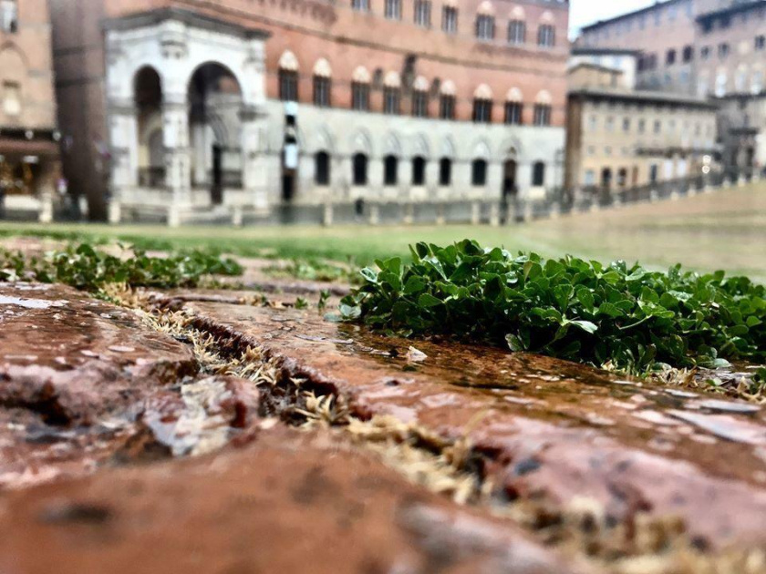Quando ho potuto, la sera dopo le otto, sono sgusciata verso la Piazza, per vederla da vicino, come se potesse scomparire. Perché la Piazza del Campo esiste se è piena di persone, di voci, di gente, di vecchi, di ragazzi che fanno corpo unico coi mattoni. Invece, in questi mesi così inimmaginabili, spesso mi sono trovata lì completamente sola, come se fossi arrivata in un mondo oltre la porta del mondo reale. Muovendomi come in un teatro chiuso perché lo spettacolo non si farà più, ho contato i colonnini, ho guardato l’erba alta, cresciuta come se davvero fosse un campo; da lontano, ho sentito – si percepiva come quando è notte fonda – l’acqua della Fonte Gaia. Cercavo dietro le finestre, tra le insegne dei Bar chiusi, provando una malinconia quasi insopportabile ai fantasmi della mia infanzia. Ho guardato in alto, tra i palazzi, come per chiedere ai muri: dove sono tutti gli altri? È così che mi sono confusa e commossa, per tutta la solitudine di questo scenario disumano. Molte volte, da giovane, nelle notti d’inverno, ho amato tornare a casa attraversando la Piazza del Campo, senza che passasse un’anima. Ma un conto è uno spazio deserto, un conto è uno spazio tolto a sé stesso. Perché la Piazza era diventata una piazza spiazzata.