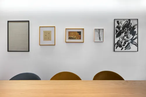 Ne sono una prova le opere in mostra. Vi è il foglio di una partitura di Giuseppe Chiari, con note cui si aggiungono interventi al limite del pittorico. Marco Cingolani disegna anche cancellando il proprio segno, lo trasforma, alla ricerca di una possibilità d’immagine data per annullamento, come in una autolimitazione finalizzata a una scoperta. Un maestro in cancellazioni, manipolazioni e interventi sull’immagine e sulla carta è Stefano Arienti, nel suo caso su un patrimonio esistente, ricercato, trovato, artista presente in mostra stavolta con disegni in cui la manipolazione materiale è assente. Di Dadamaino la scelta è caduta su opere dai segni astratti, espansivi, liberi in un movimento magmatico. Per Ketty La Rocca la linea disegno è anche scrittura sull’immagine, riprendendo la foto della statua di un corpo maschile. Luca Pancrazzi presenta la prospettiva di un angolo del suo studio con elementi e strumenti utili a produrre opere; l’immagine fa pensare al segno delle incisioni.