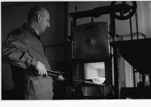 Paolo De Poli estrae dal forno un oggetto incandescente, l'Anguria, di Gio Ponti.