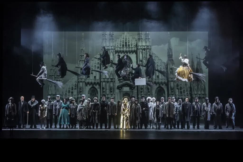 Per fare una favola ci vogliono una strega e una fata. Iniziamo dalla fata. In Miracolo a Milano con la regia di Claudio Longhi, in scena al Piccolo Teatro Strehler di Milano, la fata ha la consistenza dell’Ariel, voce di aria, di etere, presenza di cristallo puro, gioioso di luce che inonda una mattina di primavera. È Giulia Lazzarini, questa volta non sospesa in cielo e volteggiante come nella Tempesta di Strehler, ma bloccata dai suoi novantadue anni a terra, con un bastone, su una sedia a rotelle, ma leggerissima, sempre guida magica per trasportarci per cieli infiniti. Lei è Lolotta, l’anziana signora che trova sotto un cavolo il bambino Totò, nudo, abbandonato, come uno dei tanti figli della guerra, la seconda mondiale o quella di Gaza o dell’Iran. Lei, meraviglia di un bel pezzo di teatro del Novecento, è Lolotta, la trasposizione scenica della dolce vecchietta immaginata da Zavattini e De Sica nel loro film del 1951, con Totò come protagonista, con il nome ispirato a quello di Antonio de Curtis, nel 1940 ancora principe del varietà e non Comneno di Bisanzio, iniziale collaboratore alla sceneggiatura e ideale interprete della pellicola. Lei raccoglie il bambino perduto, lo fa crescere tra il suo orto ai margini della città in macerie, lo educa con le tabelline, gli insegna la bellezza delle pennellate del sole al tramonto, lo abbandona morendo, lo lascia da solo a seguire la sua bara in una delle sequenze più strazianti del film che vinse la Palma d’oro a Cannes nel 1951, della pellicola in cui il neorealismo diveniva favola, fuga dalla realtà come un atto d’accusa fantastico alla società. Lolotta, lì, nel 1951, era un’altra fata della scena, Emma Grammatica, un’altra grande signora del teatro.