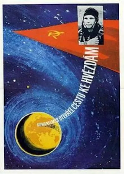 All’indomani del volo di Jurij Gagarin, che il 12 aprile 1961 diventò il primo essere umano a superare i confini dell’atmosfera terrestre, l’Amministrazione delle Poste e Telecomunicazioni della Cecoslovacchia emise un bellissimo francobollo, prodotto esemplare della scuola grafica di quel Paese nel dopoguerra. La Terra, raffigurata in basso nell’angolo sinistro dell’immagine, non è il pianeta blu che proprio Gagarin avrebbe raccontato per primo. È una sfera dorata vorticante da cui, partendo dall’Unione Sovietica, si innalza una scritta che attraversa un cielo blu scuro pieno di stelle per toccare una sorta di tappeto volante, la bandiera rossa con la falce e martello, e sorreggere una piccola fotografia in bianco e nero di Gagarin dall’aria molto russa, con la cuffia da aviatore che somiglia vagamente a un colbacco, come se fosse diventato già un pezzo di storia e un’icona, mentre l’impresa che lui aveva avviato è proiettata verso il futuro. Nella dinamica della sua costruzione geometrica, è un racconto completo ma senza realismo, una revisione dei canoni monumentali tipici delle raffigurazioni sovietiche, con un’estetica costruttivista filtrata dal modernismo mitteleuropeo. Il suo nucleo, ad ogni modo, sta nella scritta che si ingrandisce a mano a mano che si innalza verso Gagarin e che è a tutti gli effetti un elemento compositivo del disegno, anche se quel che dice ha un’importanza non meno decisiva: il Comunismo apre la via alle stelle. C’era da esserne orgogliosi, indubbiamente, e non bisognava perdere l’occasione, né dal punto di vista grafico del design, né da quello dei suoi significati.