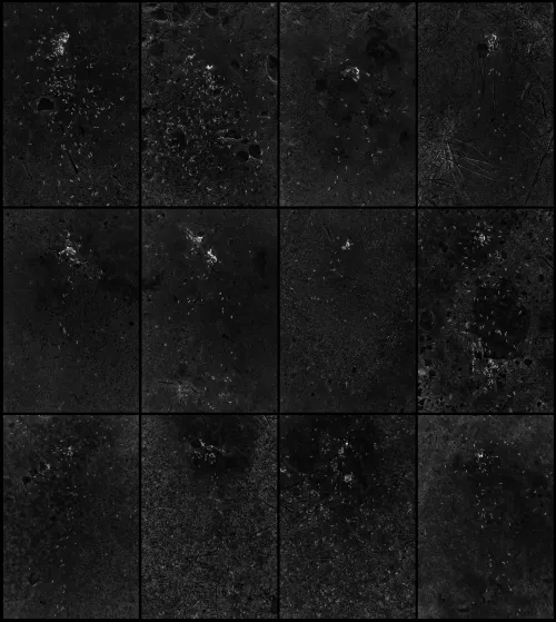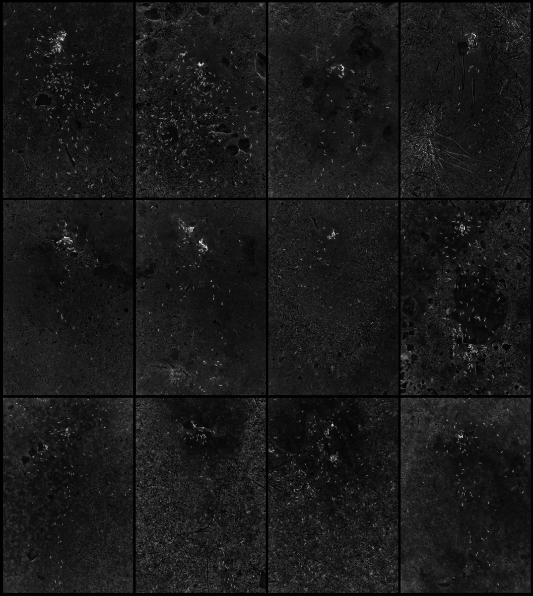 TM: Esatto. Dopo avere anneriti i vetrini, la seconda fase è stata quella di prendere l'impronta del corpo, pezzo per pezzo, partendo dalla testa fino ai piedi, dopodiché i vetrini sono stati ricomposti e trasportati in un bosco, dove li ho lasciati per alcuni giorni, cosicché all'impronta del corpo si sono sovrapposte una miriade di tracce, tracce di passaggio di insetti, tracce degli agenti atmosferici, pioggia, foglie, fango, qualsiasi cosa è accaduta in quel luogo e in quel tempo viene registrata da questa superficie molto sensibile. Quando poi decido di ritirare questi vetri, questa “trappola per tracce”, nel caso del volto, che ha delle dimensioni più limitate, lo ricompongo e faccio dei contatti in camera oscura, nel caso invece del corpo diventava troppo complicato fare un unico contatto, perché posizionare 680 vetrini su un foglio, avere anche la planarità eccetera, diventava improbabile, ho fatto dei contatti di gruppi di vetrini, poi li ho scansionati e ho ricomposto il corpo digitalmente.